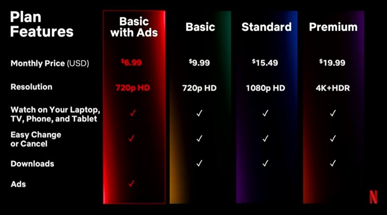 넷플릭스가 새로운 광고요금제를 발표했다. 기존 요금제는 유지하고 새로운 요금 옵션을 추가한 것이다. 새로운 요금제는 Basic with Ads라는 명칭으로 6.99달러다. 이 요금제는 컨텐츠 시작 전과 진행 중에 스킵이 불가한 15~30초 분량의 광고를 시청해야한다. 동시 접속은 1명까지 가능하고 720p HD급으로 컨텐츠를 볼 수 있다. 라이센스 이슈로 몇 개 컨텐츠는 시청할 수가 없으며 다운로드도 불가하다. 인터넷 커뮤니티 등 사람들의 반응을 살펴보면 '티비가 되어버렸네' 등 대부분 부정적이다. (그러면 기존 요금제 쓰지 왜?) 이 변화가 넷플릭스엔 어떤 영향을 미칠까?
