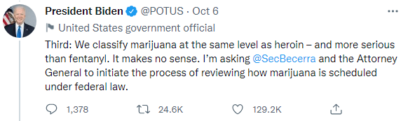 바이든의 트위터에서 "펜타닐보다 더 심각하다" 라는 말에 대해 의문을 갖으며, 스케줄 조정에 대한 말도 언급했다. 스케줄은 약물이 위험하거나 중독성이 높은 정도로 분류하는 건데 펜타닐이 2급이므로 마리화나는 스케줄 3으로 변경될 것에 대한 내용으로 해석할 수 있겠다.