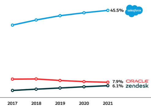 고객서비스 및 CRM, 마케팅 부분에선 거의 경쟁도 적은데, 독보적인 시장 점유율을 가지고 있다. 실제로 세일즈포스를 사용하는 고객사도 그렇고 만족도가 상당히 높다는 것을 알 수 있다.  고객 만족도 지표도 타 솔루션 기업인 마이크로소프트 나 오라클, SAP 과 같은 전통 강자들과 비교해도 매우 높은데, 한 번 세일즈포스 생태계에 락인된 기업은 떠나지 않을 것이다. 구매담당자도 원치 않고 다시 새로운 솔루션을 배워야하는 임직원들도 원치 않을것이다.
