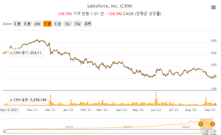최근 연준의 급격한 금리 인상과 며칠전 발표된 미국 CPI (소비자물가지수) 가 예상치에 상회하여 또다시 9월 자이언트 스텝론이 고개를 들고 있다. 이런 상황에서 많은 기업들의 주가가 맥을 못추고 추풍낙엽으로 떨어지고 있는데 빅테크 뜨거운 감자였던 세일즈포스 또한 그런 기업중 하나다.