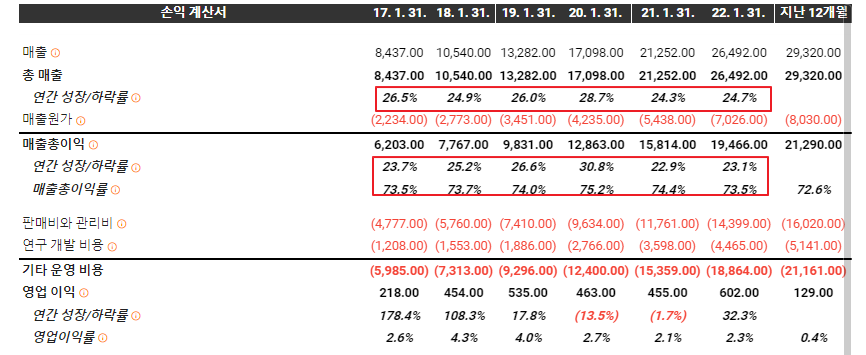 숫자를 보자. 매출 성장률이 연간 20% 중반대를 유지하며 꾸준히 성장하고 있다. '우리 1년에 딱 20%대로만 성장하자' 라고 짜놓고 영업을 하는게 아닌가 싶다.