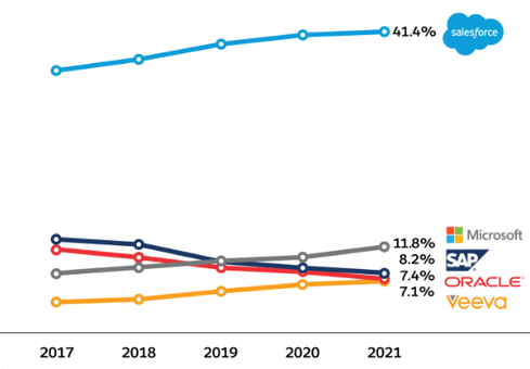 - 세일즈포스는 전 세계적으로 가장 파워풀한 CRM 솔루션이며 점유율 또한 지속적인 상승세다.