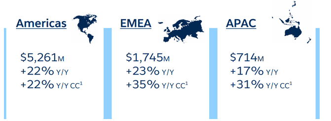 세일즈포스는 전 세계적으로 사용되는 글로벌 솔루션 기업인데 많은 대륙에서 꾸준한 성장세를 유지하고 있다. 물론 북미지역 같은 경우에는, 비중은 압도적이여도 (거의 80%) 성숙기로 접어들어 조금씩 둔화되기는 하지만 그만큼 아직 유럽과 아시아 지역에서의 추가적인 성장의 ROOM이 남아있다.
