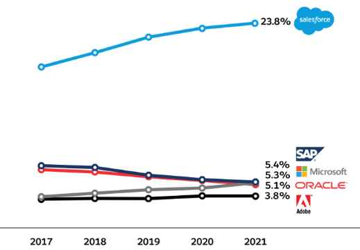 고객서비스 및 CRM, 마케팅 부분에선 거의 경쟁도 적은데, 독보적인 시장 점유율을 가지고 있다. 실제로 세일즈포스를 사용하는 고객사도 그렇고 만족도가 상당히 높다는 것을 알 수 있다. 고객 만족도 지표도 타 솔루션 기업인 마이크로소프트 나 오라클, SAP 과 같은 전통 강자들과 비교해도 매우 높은데, 한 번 세일즈포스 생태계에 락인된 기업은 떠나지 않을 것이다. 구매담당자도 원치 않고 다시 새로운 솔루션을 배워야하는 임직원들도 원치 않을것이다.