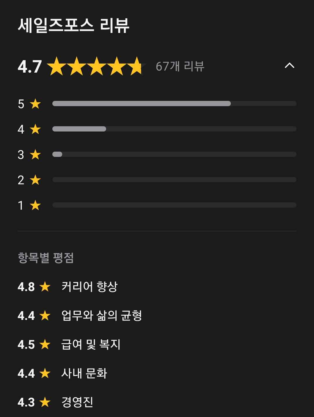 4.7점이면 배달의 민족 앱에서는 '4.8이 있을텐데~'라며 약간은 망설일수 있지만 블라인드에서의 4.7은 정말 말도 안되는 숫자다. 필자가 근무하는 기업은 3.4점으로 4.7을 보며 약간은 눈물을 흘렸다. 사실 세일즈포스 코리아로, 당연히 각 리젼별로 분위기는 다르겠지만 내가 보고자 했던 내용은 회사 워라밸이나 급여 및 복지에 대한 내용이 아니였다. 많은 영업직군 직원들이 공통적으로 하는 말을 볼 수 있었는데