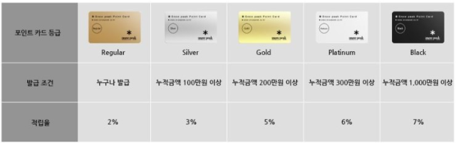 특히, 스노우피크는 멤버십 제도를 운영하며, 등급이 높은 고객에겐 한정판 구매 찬스나 다양한 베네핏을 제공하며 고객관리를 하고 있다. 공홈에 뜨기만 하면 품절되고 중고나라에 피가 붙은 리셀 매물로 올라오는 스노우피크 제품 특성상, 괜찮은 서비스다.