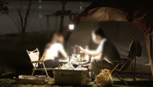 다른 장면에서는 캠핑을 즐기고 있는 커플의 모습이 나오는데, 텐트는 전실이 깊지 않은것으로 보아 왠지 스노우피크 어메니티돔 같고 남성이 앉아 있는의자는 스노우피크 로우 체어같다. 그리고 각종 수납품을 넣어 놓는 캠핑 박스 역시 동일 브랜드 상품을 사용하고 있는것 같다.