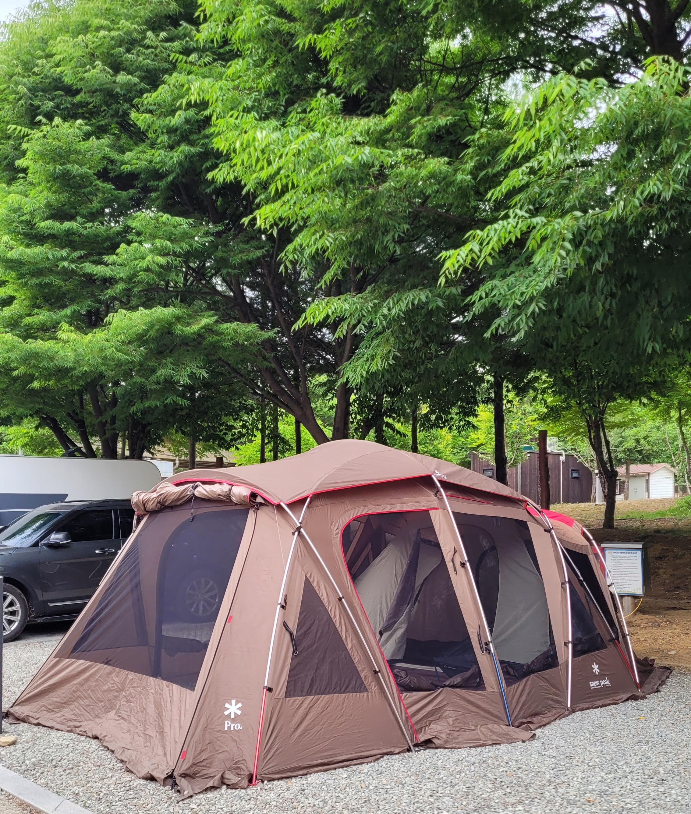 캠핑장이 시설도 좋은데, 고가의 장비들이 꽤 많이 보였다. 앞서 말했던 스노우피크의 리빙쉘 롱 프로로 보인다. 국내에서도 구하기 쉽지 않은 모델인데 이쁜 아이보리색이 다소곳이 물가에 피칭되어 있는 모습이었다.