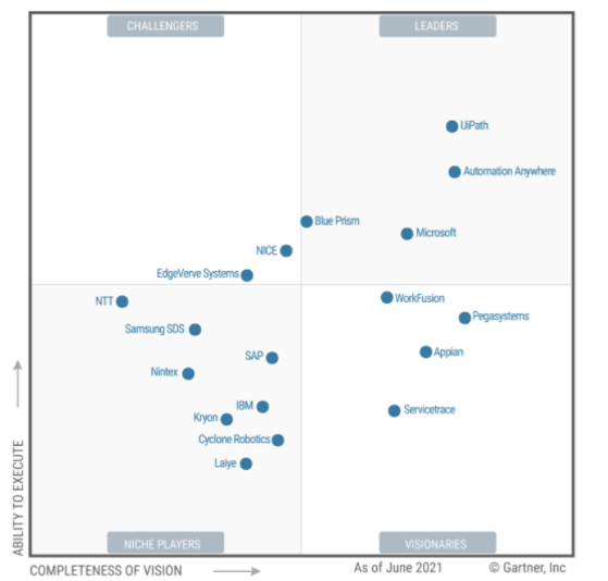 앞서 RPA는 솔루션이라고 언급했다시피, RPA를 도입하려면 RPA 라이센스를 구입해서 운용해야 한다. 시장에 다양한 플레이어들이 이미 RPA 상품을 내놓고 경쟁을 하고 있는데, 상위권은 UIpath와 Automation Anywhere(이하 AA), 블루프리즘 등이 있고 국내에서도 다양한 개발사들이 국내 상황에 특화된 상품들을 내놓고 있다.