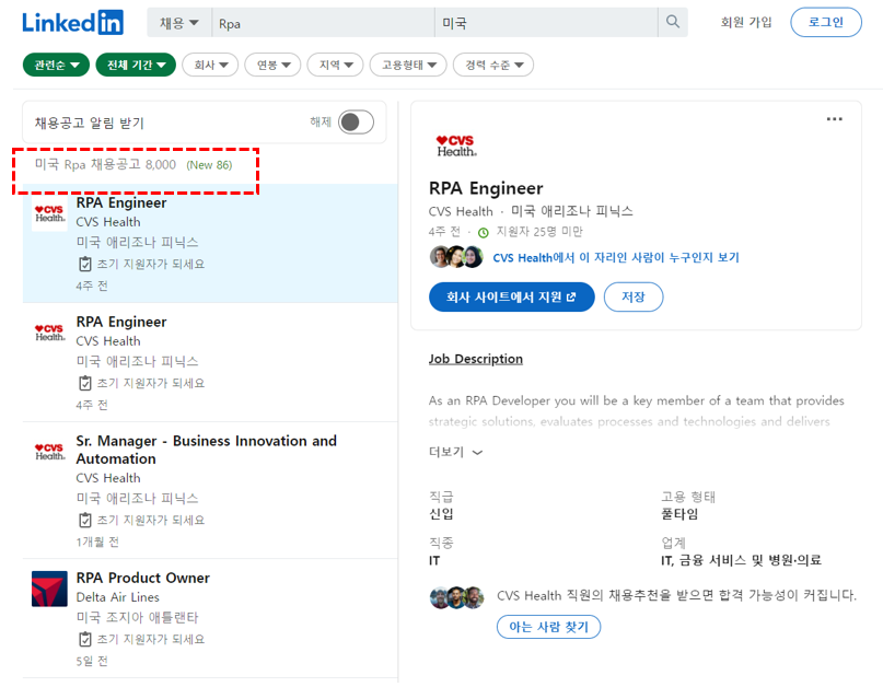 미국에서 가장 활발한 구인구직 플랫폼인 링크드인을 보자. RPA 관련한 개발자, 컨설턴트, 기획자등 다양한 직군의 채용공고가 8,000 건정도 올라와있다. 물론 파이썬 개발자는 50,000건, 자바 41,000건, HTML/CSS 54,000 건에 비하면 작은 비중이지만 그래도 지속적인 구인 구직이 있음을 알 수 있다. 사실 자동화 개발자는 특정 언어를 사용한다기보단 솔루션을 다룬다. 그래서 개발자라 말해도 되나 싶기도 하지만 보통 파이썬도 자동화로 사용할 수 있기때문에 개발자라고 해도 괜찮을 것 같다.