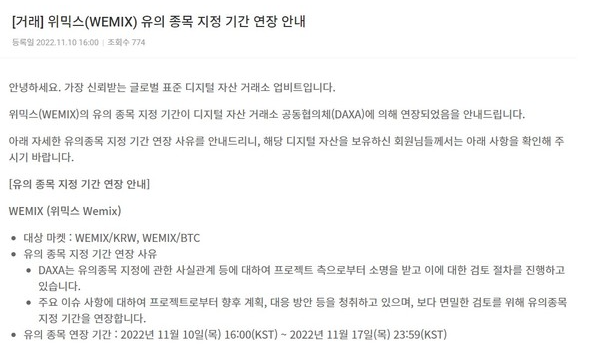 다시 처음으로 돌아와서, 위믹스의 유의 종목 관련 진행사항은, 업비트에서 위믹스 유의 종목 지정 기간을 17일 자정까지 연장했다. 아마도, 위믹스의 소명이나 자료 검토등에 시간이 좀 더 소요되기도 하는것 같다.