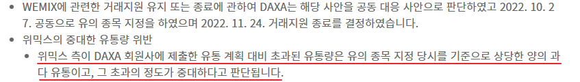 두둥.. 그것이 실제로 일어나고야 말았다. 디지털 자산 거래소 공동협의체 DAXA에서 오늘 24일에 위믹스에 대한 거래지원을 종료했다. 12월 8일 15시부터 거래가 불가해진다. 한달 가까이 길어지던 유의종목 지정후 재검토의 결과가 오늘에서야 상장폐지로 결정된 것이다.