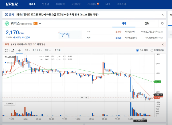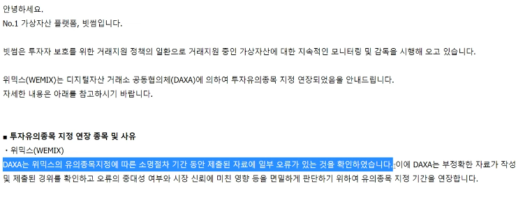 11월 17일 오후 8시 업비트와 빗썸, 코빗, 코인원, 고팍스 등 국내 주요 5대 가상자산 거래소(DAXA, 닥사)에서 동시에 위믹스 투자유의 지정을 1주일 재연장한다고 밝혔다. 다시 24일(목) 자정까지 재연장 된것이다. 금방 끝날것 같은 미스언더스탠딩이 길어지는 것을 보며 많은 투자자들의 불안감이 가중되고 있다.