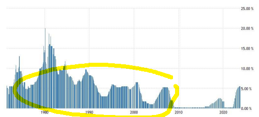 미국 금리가 세계의 통화, 각 나라의 금리를 결정하는데 가장 중요한 변수라는데 의의를 제기하는 사람은 없을것이다. 지구상에서 가장 안전하고 오래되었다는 미국의 자본시장으로부터 자유로울 수 있는 자산은 지구상에 없을 것이다. 위 그림을 보면 2010년도 전까지는 꽤 오랜 기간이 고금리 환경이었다. 80년대 하이퍼 인플레이션을 잡기위해 폴 볼커가 20%까지 금리를 올렸던 적도 볼 수 있다.