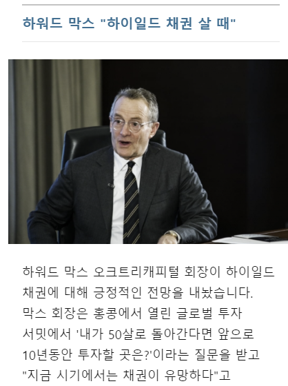 하워드막스는 투자자라기보단 Asset allocation (자산 분배)의 달인이다. 최근 하워드막스는 노골적으로 하이일드 (고위험 고금리) 채권을 권유한다. 개별 종목보다는 여러 기업이 묶여있는 상품을 사서 위험을 헷징하라고 한다. 누군가 '아니 BB등급 기업 채권이 망하면 어떡하죠?' 라고 묻는다면 그정도 되면 니가 가진 주식이나 부동산은 이미 골로갔을것이라고 한다.