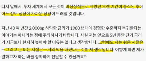 더불어 하워드 막스는 말그대로 '비정상과 쉬운 시대(Easy money)는 저물었다' 라고 이야기한다. 축제는 끝나고 다들 정신차리고 출근하라는 이야기다. 아니 난 이제 막 들어왔는데.. 무슨일이지..?