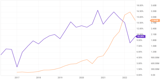아직은 경기 침체다, 인플레이션의 초입에 있다, 많은 의견들이 갈리고 있는 때다. 월가의 구루들도 누구는 낙관적으로, 누구는 다시금 드럼을 치며 숏을 치고 있다. 하지만 미국 자동차 시장의 전반적인 하락은 이미 정해진 방향이다. 새로운 공급 증가, 인플레를 반영한 높은 차량 가격에 의한 필로도, 실질 임금 하락으로 인한 위축된 소비자 심리가 명백하다. 현재의 상태로 보면 Carvana가 이 상황속에서 살아남을 것인가에 대한 확신도 사그라든다. Carvana는 단단한 이익을 얻기 위해서는 차를 싸게 사서 비싸게 팔고 기업의 다양한 비용을 떨구고도 많은 이익이 남아야 한다. Carvana는 보통 10% 정도의 이익을 가지고 있었는데 최근 1년, 이 숫자도 급격히 감소하고 있으며 동시에 재고는 급격히 증가하고 있다. (아래 그래프)