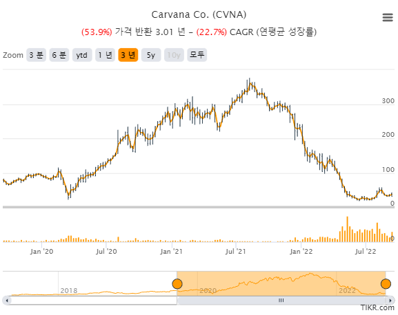 하지만 자동차를 판매하면서 발생하는 낮은 이익(혹은 손실)과 중고차 가격이 신차에 버금가게끔 비싸짐에 따라 거래가 점점 감소하고, 연준의 금리 인상과 유동성 수도꼭지 잠금에 따라 차에 대한 사람들의 니즈 자체를 꺾어버렸다. 카바나는 자본 희석 및 부채를 조달하며 현금 흐름의 감소를 방어했으나 현재의 상황이 당장 1,2년 안에 끝날 기미는 없어 카바나로써는 썩 난관적이지 않은 상황이 되어버렸다. 더군다나 상당한 이자 비용 부담으로 실제 수익을 기대하기 힘든 상태고, 이 모든 악재를 반영하듯 Carvana는 최근에 큰 하락이 있기도 했다.