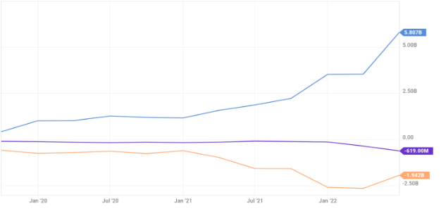 또한 회사의 당기 순이익도 영업, 투자 현금 흐름과 조금 동떨어져서 다른 모습을 나타내고 있다. (아래 그래프)