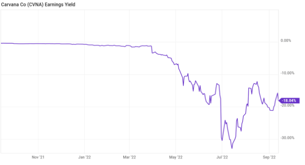 카바나는 성장주로 수익으로 평가하기엔 무리가 있으므로 주식의 기대 이익을 시장 가격으로 나눈 Earnings yield(이익 수익률?)로 살펴보면 상태가 매우 안좋다는것을 알 수 있다. (아래 그래프)