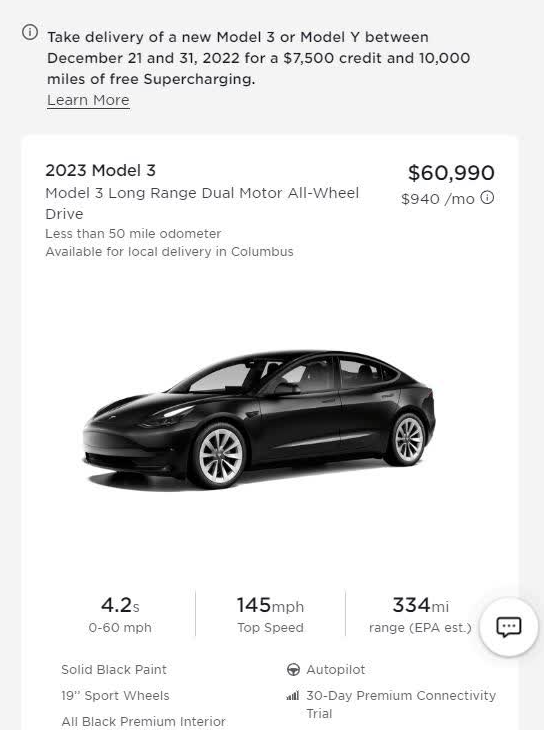 테슬라가 할인을 시작했다. 물론 올해 한정이라고는 하지만 콧대높게 올려만 오던 현재까지의 행보와 달라서 의미가 있다. 북미 기준 23년형 모델S와 모델Y 대상으로 7,500달러 정도의 프로모션을 제공하고 있다. 실제 주문 웹사이트에 가면 2022년 12월 31일 딜리버리 기준으로 7,500달러 차감되는 것을 볼 수 있다. 할인 행사는 테슬라 투자자들로 하여금 재고 과잉에 대한 걱정과 출고 촉진으로 실적 상승이라는 기대를 하게 만든다.
