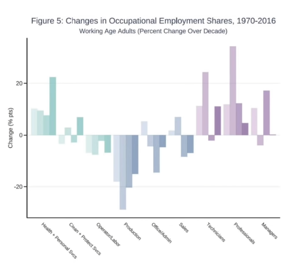 특히 SW의 발전과 함께 일반 사무직은 RPA (Robotic Process Automation) 이나 AI 등으로 대체되고있다. 사무직들의 업무중엔 단순 반복 작업이나 '인지 업무'가 많은데, 이런 부분이 RPA로도 대체될 수 있다는 것이다. 다만 오해가 많은 부분은, 한 사람의 전체 일자리가 통째로 사라지는 것이 아니라 전체 업무중의 20~30%가 RPA 자동화로 대체 된다는 것이다. 그러므로 전체 사무직의 전체 볼륨 자체는 줄어들고있다.