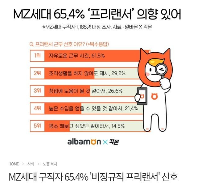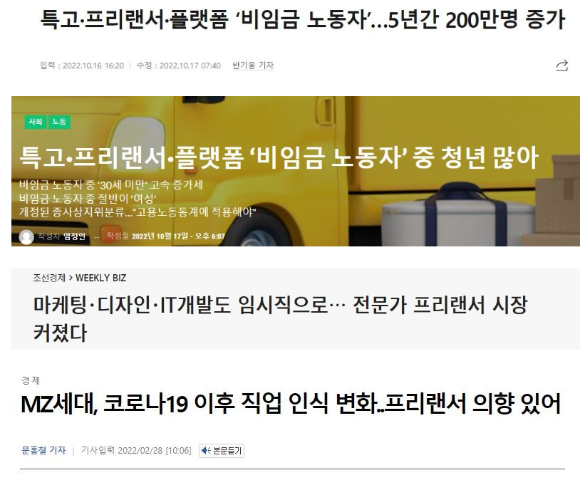 유튜브, 블로그, 배달 서비스, 개인 재능 거래 플랫폼이 활성화 되면서 개인들도 회사의 울타리를 벗어나 할 수 있는 것이 많아졌다. 이 시장이야말로 완전 유연한 고용시장인데, 이미 '프리랜서'라는 개념으로 오래전 부터 있었다.