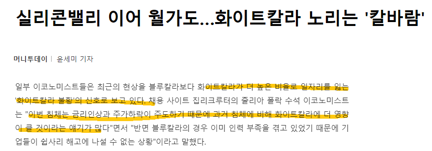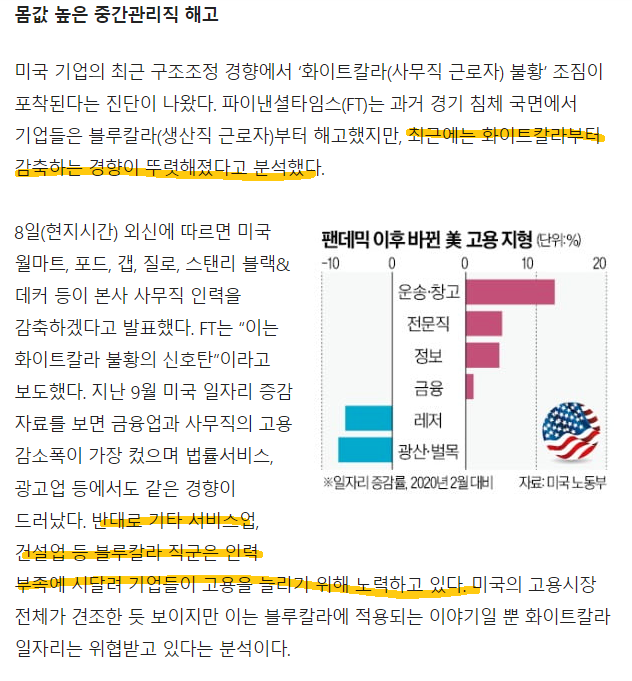 아찔한 기사긴 한데 몸값 높은 '중간 관리자' 즉 화이트칼라부터 칼바람이 일고 있다는 것이다. 권력을 쥐고있는 C레벨급 고위 관리자나, 아직은 저렴한 인건비에 쓸모도 많은 실무자보다는 비교적 높은 인건비에 언제든 대체 가능한 '중간 관리자' 부터 칼바람의 대상이라는 것이다. 갑자기 회사에 나이 지긋하신 팀장 형님들의 얼굴이 스쳐지나간다. '형님들 오래 보고 싶습니다.'