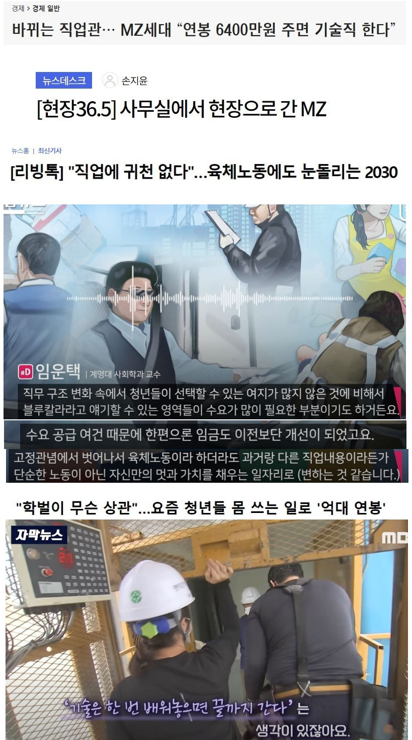 앞서 말한, 화이트칼라와 개발자의 거품이 빠지면서 다시 땀 흘리는 직업이 주목받고 있다. 필자의 직장 동료들이나 선배들도 보면 '기술도 없고 대체 가능한 우리 일보다는 역시 기술이 최고다..' 라는 말을 자주 듣고는 한다. 하루종일 엑셀이나 파워포인트로 보고서를 쓰는 일보다는 목수, 미장 처럼 전문 기술이 오히려 낫다는 의견도 많다. 또한, 사회 기간 산업의 일자리는 계속 있지만, 고령화와 기피로 인해 공급은 적다보니 임금은 높아지고 있다.