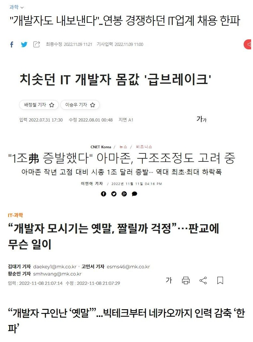 최강 노조가 버티고있는 한국에서는 구조조정은 흡사 금기어와 마찬가지다. 하지만 우리도 현재 경제 상황에서 자유로울 순 없다. 최근 스타트업이나 VC쪽에서 대기업의 투자 금액이 씨가 말랐다고들 한다. 한 때 앞다투어 시리즈 A니 C니 엔젤투자니 돈 쓸 곳을 찾아 헤메이던 모습에서 불과 1년이 채 지나지 않아 시장상황이 180도 바뀌었다. 가까운 SI업체 사장님들과 연락을해서 보면, 대기업의 프로젝트가 적어지니, 2차 3차 발주를 먹고 사는 소형 SI 업체들도 일감이 끊기고 어쩔 수 없이 인력들을 내보내고 있다고 한다. 한 때 너도나도 모셔가던 개발자 들 중에서도, 아직은 경험과 연차가 낮은 초급 개발자들 부터 무너지고 있는 모양이다.