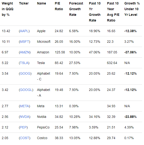 QQQ는 전체 비중에서 50%이상이 상위 10개 기업이 차지하고있다. 매우 무거운 주식이다. 따라서 상위 기업들의 상방이 얼마나 열려있는지에 따라서 QQQ의 P/E 비율이 21에서 더 올라갈 수 있는지 보려면, 그 상위 10개 기업들의 향후 성장성이 매우 중요하다.