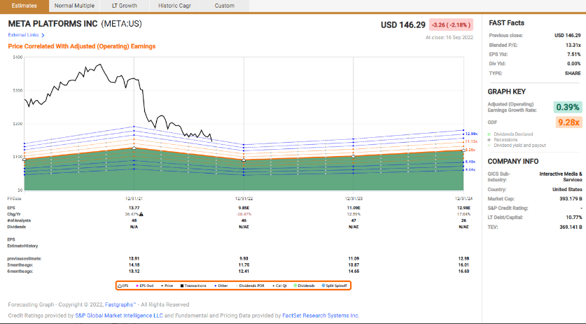 메타를 살펴보면 22년 1월 반절 가까이 큰 하락을 거쳐서 현재 P/E ratio 가 13에 불과하다. 한때 전 세계인들을 연결해주던 테크 혁신기업의 P/E가 거의 제조업 수준이다. 반절 가까이 빠져서 안전마진을 부르짖으며 들어간 투자자들이 많지만 7월 실적 발표에 틱톡과 같은 경쟁 서비스의 엄청난 성장으로 고전을 면치 못하고 있다.