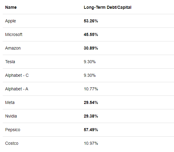 더군다나, QQQ의 절반을 차지하는 상위 10개 기업은 부채비율이 그렇게 양호하진 않다. 그 동안의 저금리를 한 껏 활용하여 자본의 많은 부분을 대출로 전환했기 때문이다. 매 FOMC마다 오르는 미국의 금리 상황에선 이런 기업들의 비용은 증가하고 수익에 악영향을 미친다.